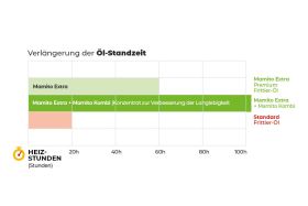 Mamito Extra hat eine Standzeit von 50-60 Heizstunden, das entspricht rund 3 Wechseln pro Monat. Bei herkömmlichen Ölen liegt die Standzeit bei rund 25-30 Heizstunden, somit muss das Öl etwa 6 Mal pro Monat gewechselt werden.
